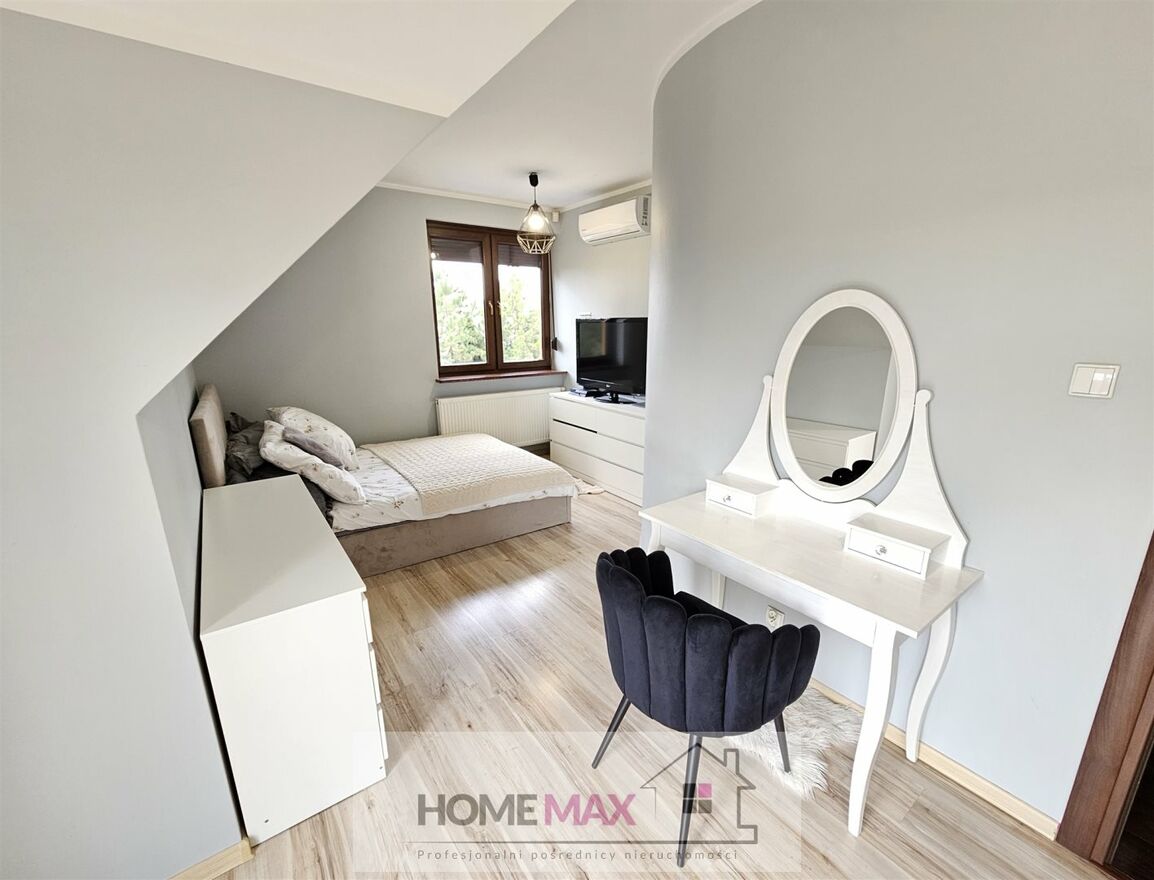 Część dzienna doskonale pełni funkcję reprezentacyjną do przyjmowania gości lub codziennego wypoczynku. Znajdziemy tam przestronny i elegancki salon z kominkiem i dużymi przeszkleniami, z wyjściem na duży taras i ogród, który stanowi idealne miejsce do relaksu na świeżym powietrzu. Mieści się tam również jadalnia oraz w pełni wyposażona i funkcjonalna kuchnia. Duże okna w domu pozwalają na maksymalne korzystanie z naturalnego światła oraz podziwianie piękna otaczającego krajobrazu. Na parterze mieści się również gościnna sypialnia, toaleta z kabiną prysznicową, holl oraz pomieszczenie gospodarcze/kotłownia. Cześć prywatna znajduje się na piętrze domu i składa się z trzech przestronnych i komfortowych pokoi, dwóch balkonów, osobnej garderoby, pokoju kąpielowego z dwiema umywalkami, kabiną prysznicową i wanną, korytarza. Nad piętrem znajduje się dodatkowa przestrzeń strychowa, która może służyć jako dodatkowy schowek.